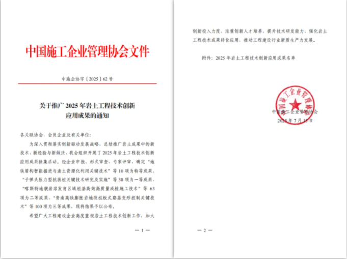 ? ? 近日,中國施工企業(yè)管理協(xié)會2025年巖土工程技術(shù)創(chuàng)新應(yīng)用成果結(jié)果正式揭曉。經(jīng)過企業(yè)申報、形式審查、專家評審等多個環(huán)節(jié)遴選,武漢市政院巖土博士創(chuàng)新工作室申報的“深厚富水圓礫層基坑地下水控制特種技術(shù)”、“敏感環(huán)境地鐵盾構(gòu)隧道穿越極硬巖特種技術(shù)”等2項技術(shù)創(chuàng)新性顯著,獲評為三等成果。